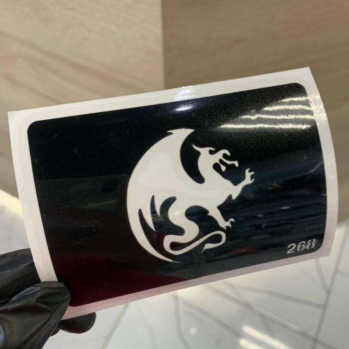 Применяется в боди-арт для изготовления временной татуировки с помощью аэрографов (аэротату), с помощью иранской или индийской хны, для изготовления блеск тату (татуировки блестками). Трафареты так же используются для декорирования поверхностей - стекла, стен в помещениях, художественного декорирования витрин. Трафарет изготовлен из специальной прочной цветной гипоаллергенной пленки на силиконизированной бумаге, в качестве клеящего состава используется полиакрилатный гипоаллергенный клей.