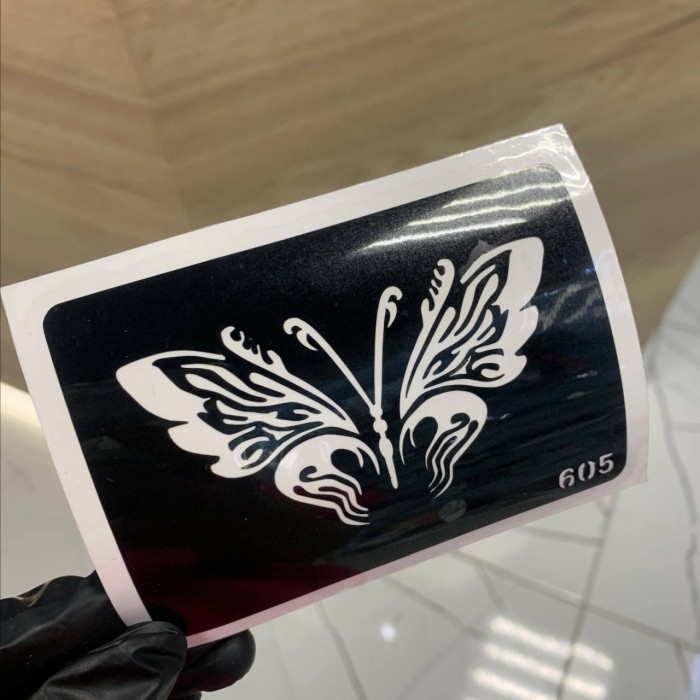 Применяется в боди-арт для изготовления временной татуировки с помощью аэрографов (аэротату), с помощью иранской или индийской хны, для изготовления блеск тату (татуировки блестками). Трафареты так же используются для декорирования поверхностей - стекла, стен в помещениях, художественного декорирования витрин. Трафарет изготовлен из специальной прочной цветной гипоаллергенной пленки на силиконизированной бумаге, в качестве клеящего состава используется полиакрилатный гипоаллергенный клей.