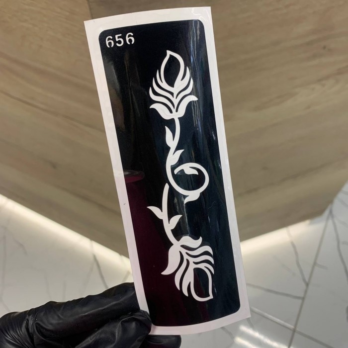 Применяется в боди-арт для изготовления временной татуировки с помощью аэрографов (аэротату), с помощью иранской или индийской хны, для изготовления блеск тату (татуировки блестками). Трафареты так же используются для декорирования поверхностей - стекла, стен в помещениях, художественного декорирования витрин. Трафарет изготовлен из специальной прочной цветной гипоаллергенной пленки на силиконизированной бумаге, в качестве клеящего состава используется полиакрилатный гипоаллергенный клей.
