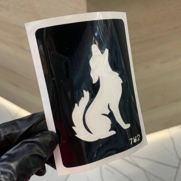 Применяется в боди-арт для изготовления временной татуировки с помощью аэрографов (аэротату), с помощью иранской или индийской хны, для изготовления блеск тату (татуировки блестками). Трафареты так же используются для декорирования поверхностей - стекла, стен в помещениях, художественного декорирования витрин. Трафарет изготовлен из специальной прочной цветной гипоаллергенной пленки на силиконизированной бумаге, в качестве клеящего состава используется полиакрилатный гипоаллергенный клей.