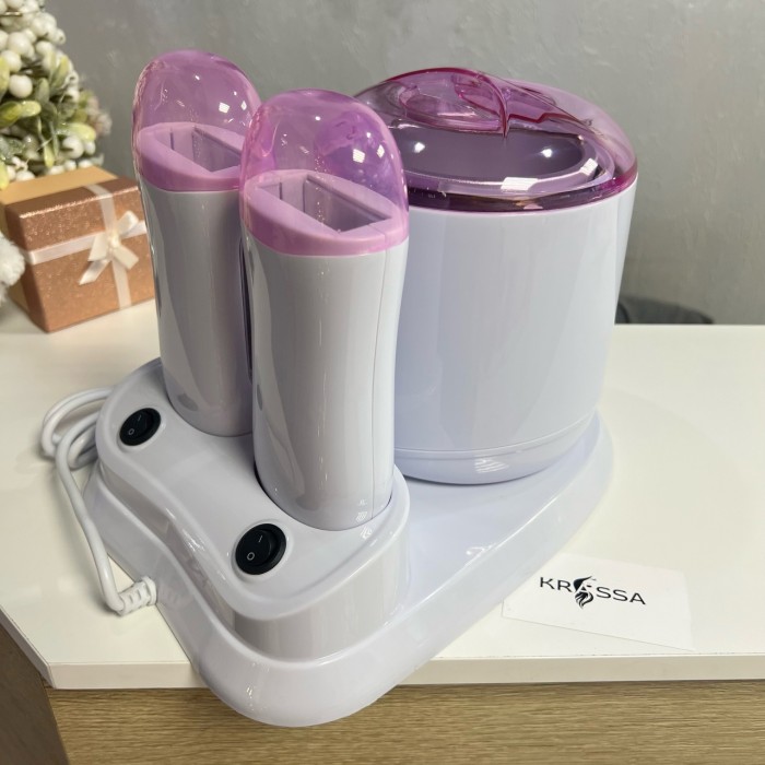 Подогреватель комбинированный позволяет одновременно разогревать 2 картриджа с воском и воск в банке, что помогает мастеру существенно сэкономить время во время процедуры депиляции. В комплект входят: подогреватель 800 мл и два подогревателя по 100 мл для картриджей. Прибор предназначен для плавления теплых и пленочных восков, разогревания горячего воска в банках, а также подогрева воска в картриджах. Может использоваться для плавления косметического парафина.