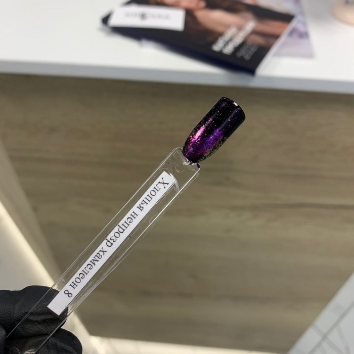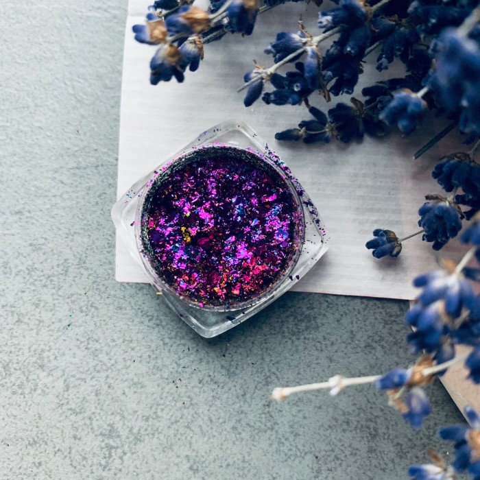 Хлопья для дизайна ногтей. В баночке выглядят непрозрачными хлопьями с отливами разных цветов (эффект хамелеона). На гель-лаках разных цветов выглядят совсем по-разному. Идеально подходят для экспериментлв с дизайном) Наносятся как втирка или похлопыванием. Могут наноситься на липкий слой и на топ без липкого слоя.
