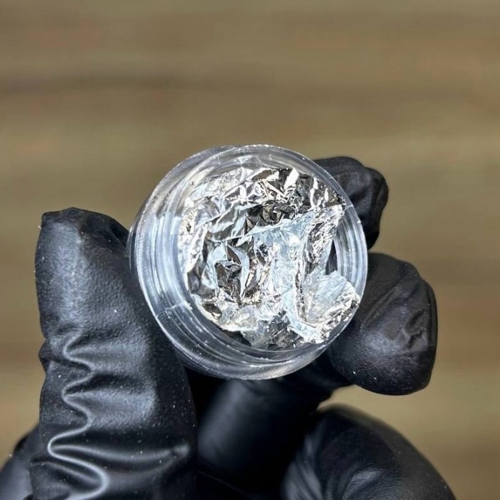 Поталь – один из видов фольги, только очень тонкой. Перед тем, как приступить к дизайну, ее разрывают на хаотичные кусочки и в таком виде крепят на ногтевую пластину. Металлизированные частички смотрятся на ногтях очень стильно и современно.