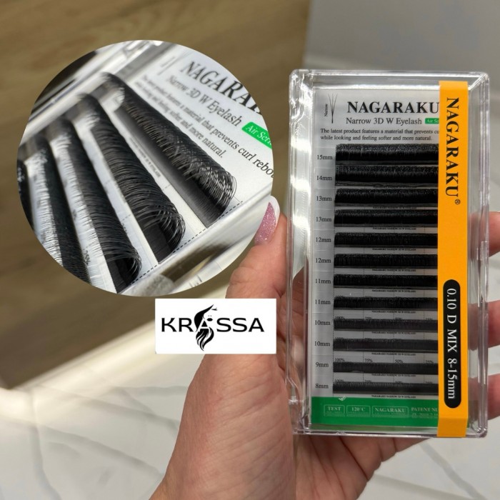 Готовые пучки 3D Nagaraku W mix – это черные матовые пучковые ресницы с длинами от 8 до 15 мм в одной палетке. Они завоевали признание за счет высокого качества, оптимальной цены и значительного сокращения времени наращивания. Здесь представлены пучки ресниц 3Д 0.10 D.
