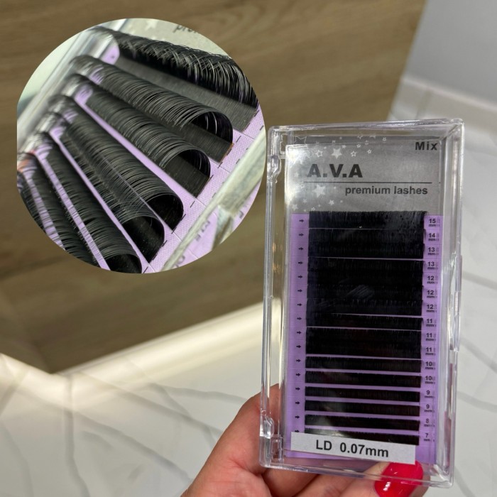 Ресницы на ленте разной длины, от 7 до 15. Всего 16 полосок-лент. Толщина 0,07. Изгиб LD.