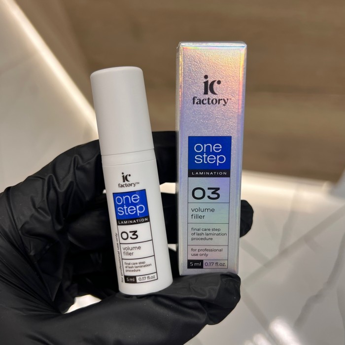 Инновационный подход к ламинированию ресниц - новая линейка бренда IC FACTORY ONE STEP LAMINATION. Не имеет аналогов на рынке! Теперь обычные составы в прошлом! Вам понадобится только один состав и вам больше не придется совершать ненужных действий. У вас будет больше свободного времени, так как на клиента вы будете тратить на 30% меньше времени!ONE STEP LAMINATION - это один состав вместо привычных двух! Состав не содержит тиогликоляты, перекись водорода и аммиак, более мягко воздействует на дисульфидные связи волоса по сравнению с обычными составами. Это позволяет максимально сохранить состояния ресниц - волос не пересушивается и не разрушается. Эффект сохраняется дольше, чем при применении обычных составов!Новая формула на основе инкапсулированного цистеамина способствует контролируемому и более мягкому воздействию цистеамина на дисульфидные связи волоса. Изгиб ресниц формируется параллельно с процессом окрашивания, когда на него наносится смесь краски и оксиданта.Состав для ламинирования ресниц ONE STEP VOLUME FILLER IC FACTORY используется на финальном этапе процедуры в качестве ухода, восстановления и защиты ресниц. Увеличивает объем и придает блеск волоскам.Гелевая текстура обволакивает каждую ресницу и разглаживает кутикулу. Водная основа позволяет дополнительно очистить ресницы от остатков клея и краски.Biotinoyl Tripeptide-1 — ключевой уходовый компонент, способен уменьшить выпадение и сделать ресницы гуще и длиннее, питает и укрепляет волосяную луковицу, замедляет процесс старения волос.Hydrolyzed Keratin, Hydrolyzed Silk — питают фолликулы, стимулируют рост и регенерацию волосков.Arginine, Glycine — специально подобранный комплекс аминокислот, который увлажняет и кондиционирует волосы, усиливает структуру, восстанавливает, способствует сохранению цвета после окрашивания.Allantoin — восстанавливает ломкие и ослабленные волоски, смягчает жесткие.