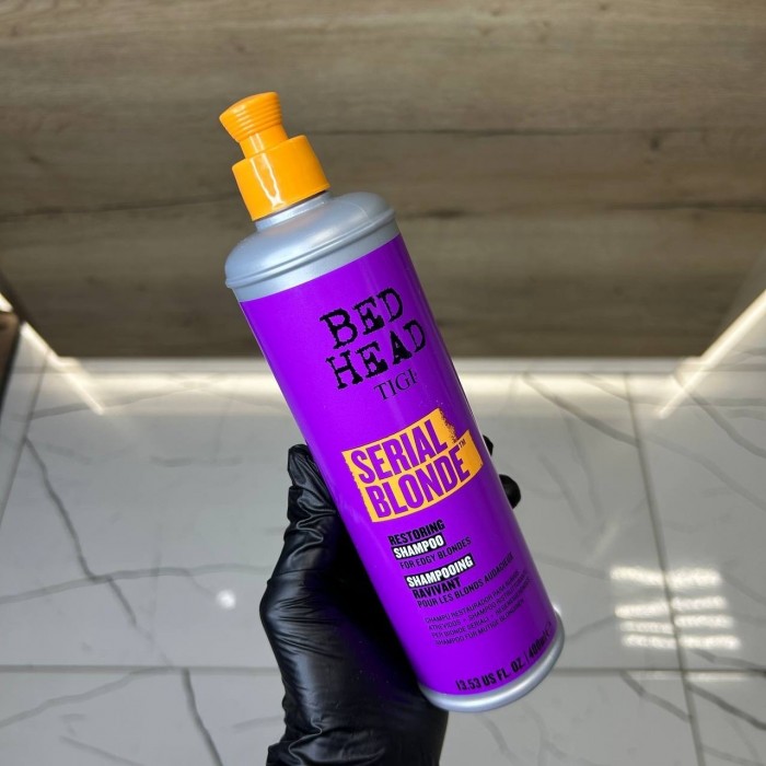 TIGI Bed Head Serial Blonde Restoring Shampoo - восстанавливающий шампунь для блондинок, который помогает вернуть светлым волосам их сияющий вид, помогает восстановить повреждения, защитить волосы от повреждений в будущем и сохранить здоровый светлый цвет волос, глубоко очищает, увлажняет и смягчает волосы. Подходит для мягких, гладких и здоровых светлых волос.Состав: water (aqua/eau), sodium laureth sulfate, cocamidopropyl betaine, glycerin, potassium chloride, dimethiconol, fragrance (parfum), sodium benzoate, glycol distearate, gluconolactone, guar hydroxypropyltrimonium chloride, sodium chloride, acrylates/beheneth-25 methacrylate copolymer, citric acid, tea-dodecylbenzenesulfonate, sodium sulfate, cocamide mea, arginine, trehalose, hydrolyzed milk protein, laureth-23, hydrolyzed keratin, lysine hcl, disodium edta, peg-45m, phenoxyethanol, benzophenone-4, magnesium carbonate, sodium lauryl sulfate, silica, ppg-9, mica (ci 77019), titanium dioxide (ci 77891), blue 1 (ci 42090), red 33 (ci 17200), yellow 6 (ci 15985).Способ применения. Нанеси на влажные волосы, вспень массажными движениями и смой. Для более глубокого восстановления используй вместе с восстанавливающим кондиционером.